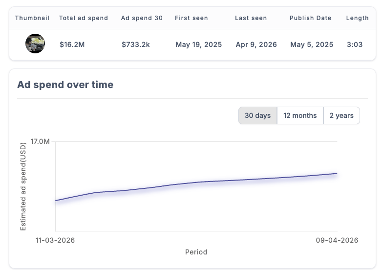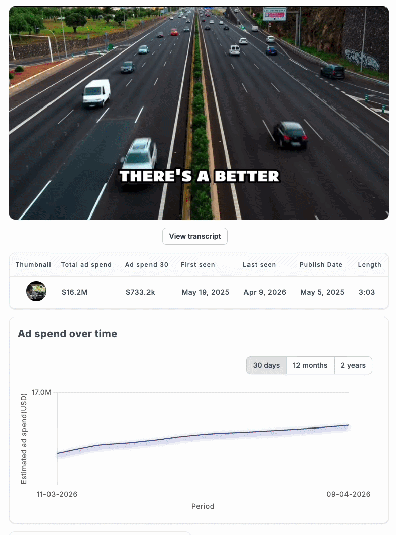 The point is that this advertiser built a script in a Google Doc, used some stock footage, and has been printing $733K a month with it for almost a year. No influencer. No studio. No product demo. Just a really well-engineered argument for why a very specific person should click a link right now.