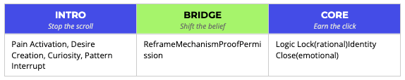 We break almost every video ad into three parts: the Intro, the Bridge, and the Core. Each has a specific job.